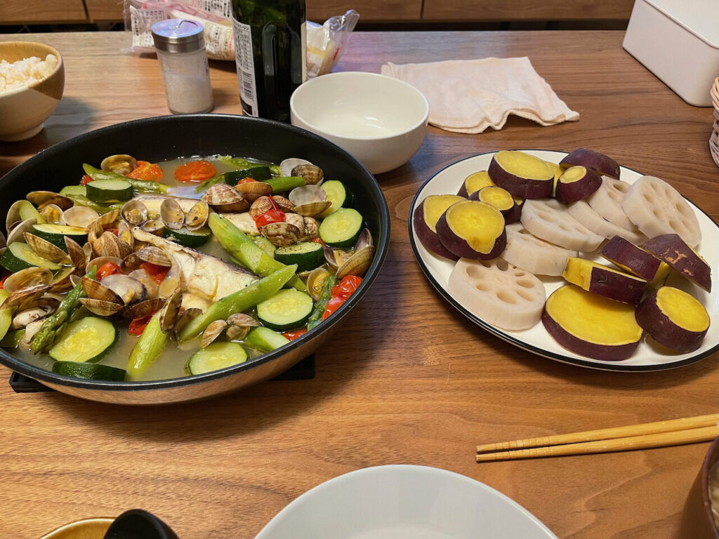 アクアパッツァと温野菜、舞茸ともやしの具だくさんお味噌汁なので、大したことはないのですが、作っていて楽しかったし、お世辞でも美味しいと行ってくれるのも嬉しかったです。